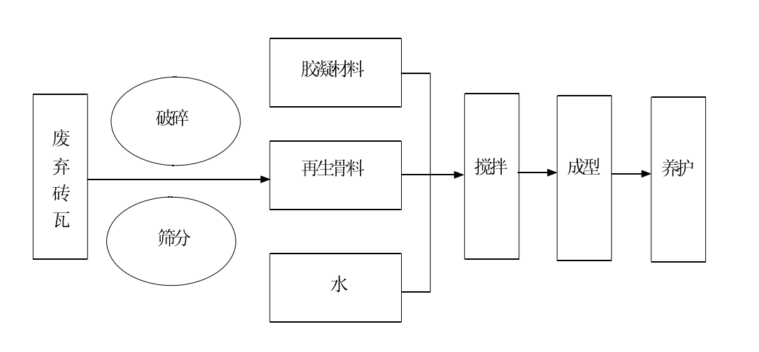 目前國內(nèi)建筑垃圾再生磚的生產(chǎn)廠家日益增多,所生產(chǎn)的建筑垃圾再生制品涵蓋了再生混凝土三孔磚、再生混凝土多孔磚、再生混凝土路緣磚、標準磚、空心砌塊、輕體墻板、環(huán)保裝飾磚、荷蘭磚、仿古磚等。已經(jīng)形成了年消納建筑垃圾超過 1000 萬噸、生產(chǎn)各類再生磚近 10 億塊、再生骨料 400 萬方、砌塊及墻板 300 萬方的生產(chǎn)規(guī)模。建筑垃圾制磚主要利用的是廢棄磚瓦骨料,大致工藝流程如圖所示。