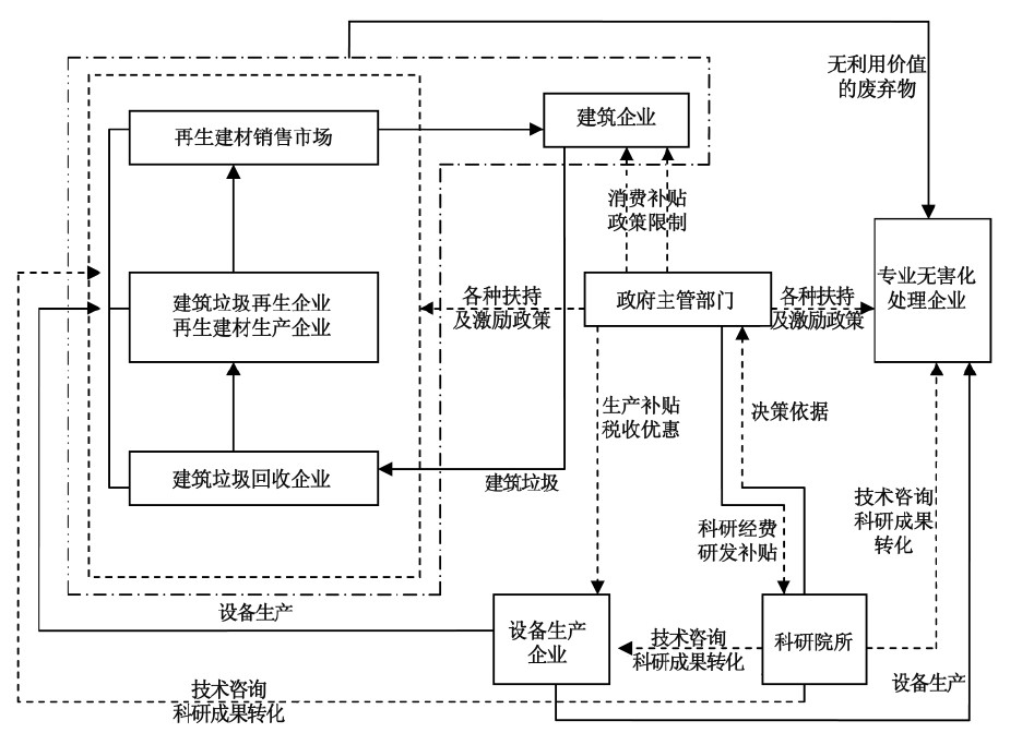 建筑企業(yè)付費將建筑垃圾委托給建筑垃圾回收企業(yè)處理。建筑垃圾回收企業(yè)通過專業(yè)化的回收程序進行回收和分類,提高建筑垃圾的回收利用率。有利用價值的建筑垃圾輸送給再生企業(yè),生產(chǎn)再生建筑材料,并通過再生建材市場出售給建筑企業(yè),實現(xiàn)產(chǎn)業(yè)循環(huán)。無利用價值的廢物付費給無害化處理企業(yè)進行無害化處理。設(shè)備制造企業(yè)為建筑垃圾回收企業(yè)、再生企業(yè)、無害化處理企業(yè)提供設(shè)備支持?蒲性核鶠楫a(chǎn)業(yè)內(nèi)各企業(yè)提供技術(shù)咨詢服務(wù),將先進的科研成果轉(zhuǎn)化為產(chǎn)業(yè)內(nèi)各企業(yè)的生產(chǎn)力,并為政府主管部門提供決策依據(jù)。